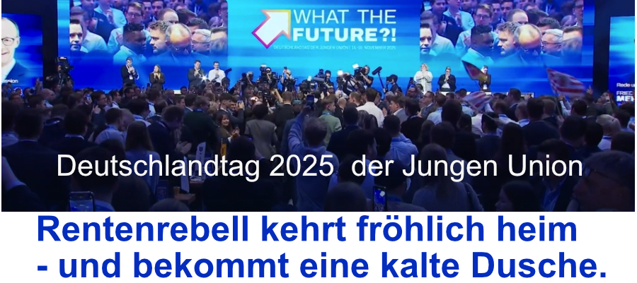 Die Geschichte ist eine reale Fiktion. Möglich wäre sie, wenn in der Versammlung einige Personen gesessen hätten, die aus normalen Rentenversichertenhaushalten gekommen wären. Der Verdacht ist allerdings, dass die übergroße Zahl Haushalten entstammen, die ihre Einkommen als Beamte, Politiker, gut situierte Selbständige oder als Ärzte, Rechtsanwälte, Architekten o.ä. beziehen oder bezogen. Typisch unter den versammelten des „Deutschlandtages“ sind wohl eher Karrieren, wie sie die „Junge Gruppe“ der Unionsfraktion im Bundestag durchlaufen. Deren Lebenserfahrungen fundieren meist aus Saal-umgebungen: Kreissaal – Hörsaal – Plenarsaal (letzteres auch in politischen Vorfeldorganisationen, die sich wissenschaftliche Beratung, Stiftungen oder NGO nennen).
